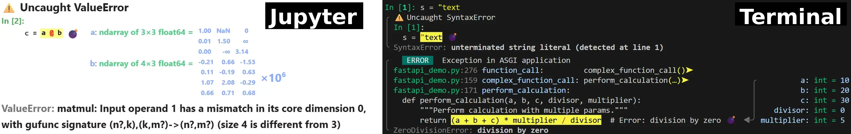 - HTML output - Works in Jupyter, Colab, and web frameworks such as FastAPI and Sanic as the debug mode error handler.