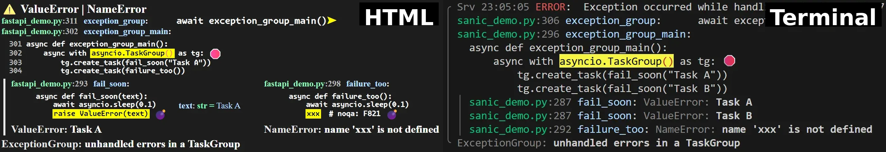 Python 3.11+ introduced ExceptionGroup for parallel execution errors (e.g., asyncio.TaskGroup). TraceRite displays these clearly.
